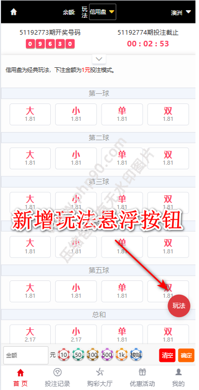 5:新增加了投注区一个悬浮按钮,点击后即可展开玩法区域方便操作!